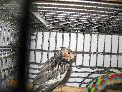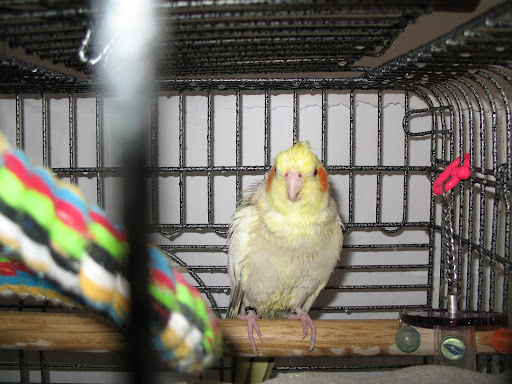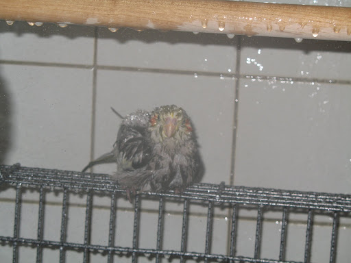 Spikey is dus gek op douchen, hij liet zich helemaal gaan. Ze zaten eerst in de kooi naast elkaar en beide met hun vleugeltjes wijd, gingen ze elkaar toch perongeluk kroelen, omdat ze helemaal in elkaar verstrikt raakte  ;D. Daarna op de kooi, waar ze ook er ook weer snel genoeg van hadden. Ik heb maar een paar foto's, alleen die van op de kooi, dus dat is wel jammer, maar durfde ze er niet meteen op te zetten. Spikey was echt klets nat en ging daarna dus slapen. Ik maakte daar best zorgen om, want dacht die vat echt koud zo. Hij liet ook een spledder poepje, hij maakte helemaal geen aanstalte om zich te wassen of zo. Mijn vriend hem er dus uitgehaald en in handdoek gedaan, maar dat vond hij niets. Toen hebben we hem eerst maar even bezig gehouden, zodat hij toch wat droger werd en uiteindelijk mocht ik hem uitgebreid kroelen en heb hem zo wat droog gemaakt. HIerna ging hij zichzelf gelukkig ook wassen.