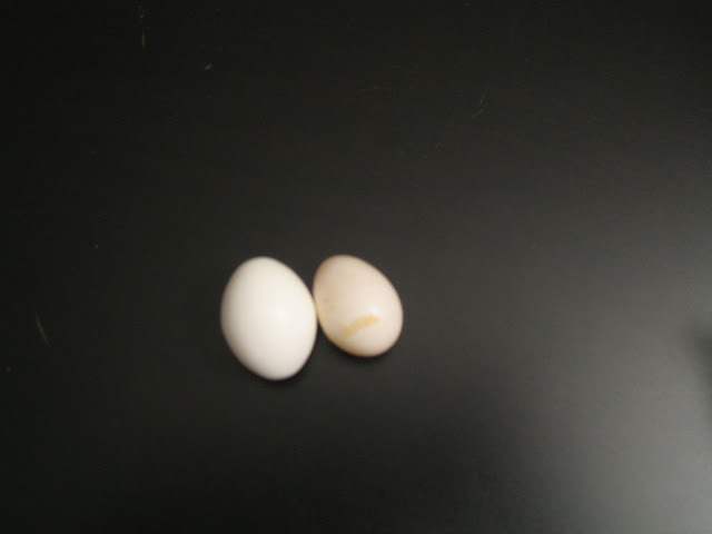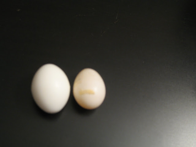 Links is nep eitje, rechts is het gevallen eitje (hij was gewoon nog wel heel, maar wel een gaatje in)