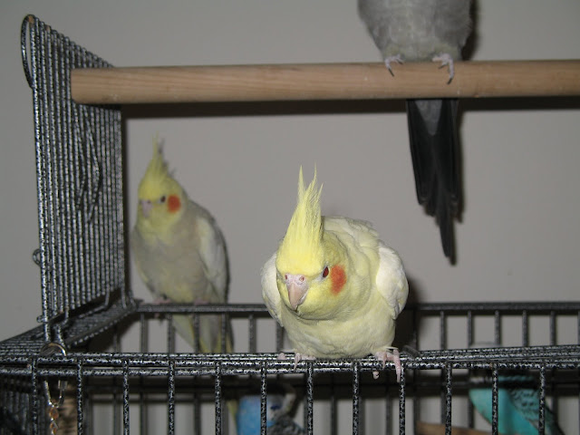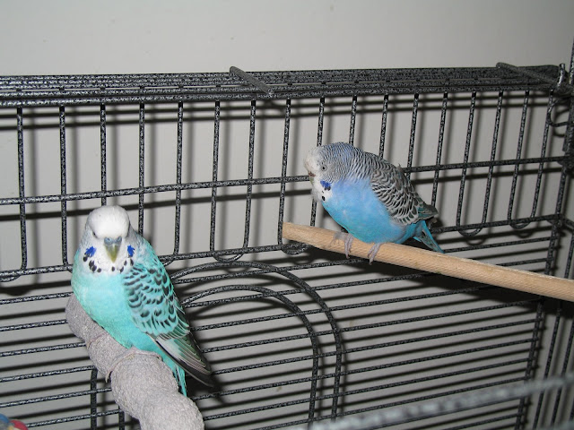 Sjimmie en Sammie. Ze komen ook altijd even uit de kooi, vliegen een rondje of twee en gaan dan weer terug in hun kooi zitten.