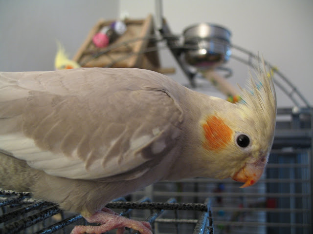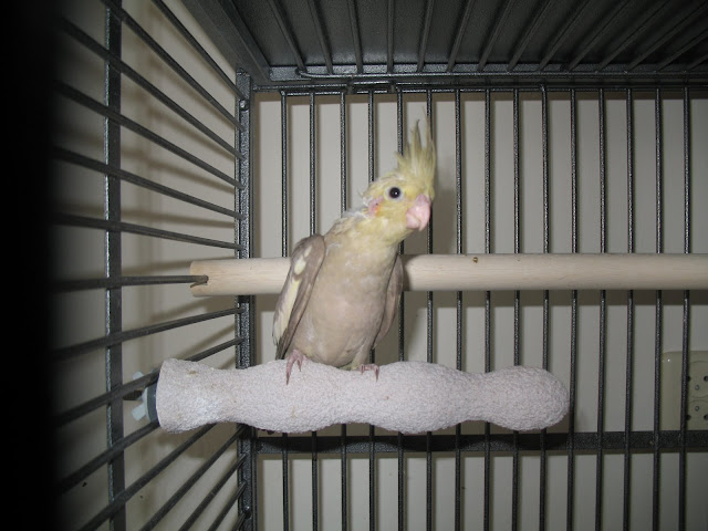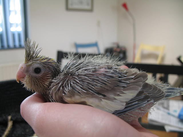 Helaas ging Izzie plukken toen ze 4 weken oud waren. HIerdoor verhuisde ze naar een mand onder in de kooi.